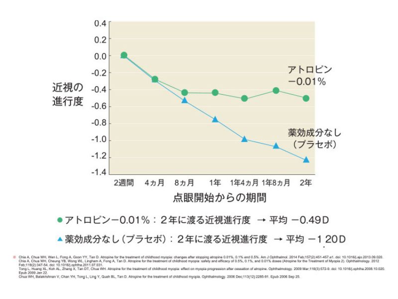 低濃度アトロピン点眼薬は、近視の進行を遅らせる(眼軸長の進展を抑制する)という点で統計的にも臨床的にも有意な効果が確認されている治療法の一つです。最適な超低濃度のアトロピンを点眼することにより、近視の進行スピードを抑え、同時にアトロピン1%点眼薬のような不快な副作用や近視のリバウンドを回避します。